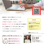 2025年10月27日 / 最終更新日 : 2025年10月27日 JTA 12/6(土)マネーセミナー開催のお知らせ! ~”女性のためのマネープランニング講座”のご案内~ cafe towaさんにて【12月6日(土)】に、 女性に人気の無料マネーセミナーを開催します! カフェのケーキ&ドリンク付きで、 リラックスし […]